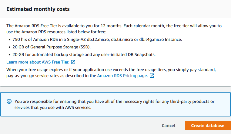 Inside the RDS service, create a database, either by navigating to the Database section, or just click the "Create database" button: