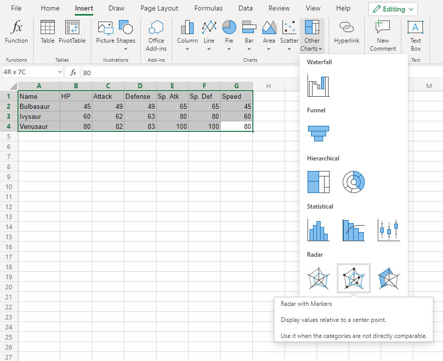 1. Click on the Insert menu, then click on the Other Charts menu () and choose Radar with Markers () from the drop-down menu
