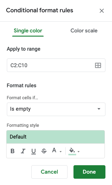 Color Scales are premade types of conditional formatting in Google Sheets used to highlight cells in a range to indicate how large or small the cell values are.